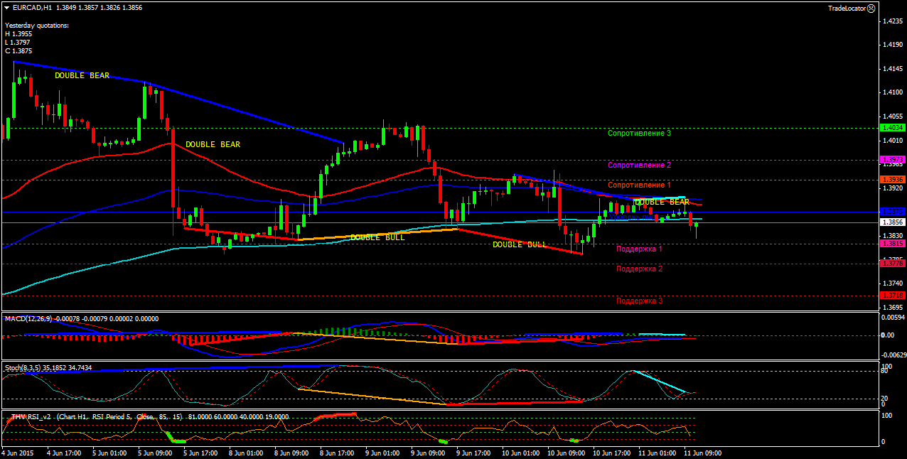 Пара EUR/CAD H1. Индикатор MACD -находится в отрицательной зоне и поддерживает продажи. Индикатор стохастик -подходит к зоне перепроданности и пока поддерживает продажи. Индикатор RSI-так же поддерживает продажи. Северные цели: сопротивление -1(1.3917), сопротивление-2(1.3976), сопротивление-3(1.4038). Южные цели: поддержка-1(1.3794), поддержка-2(1.3739), поддержка-3(1.3670). Цена торгуется в нисходящем канале,ниже скользящих средних(ЕМА) с периодами (50,100,200).