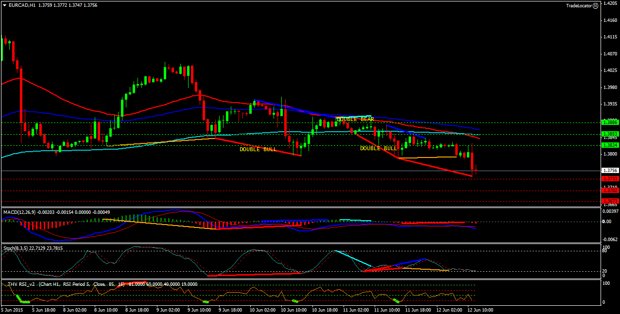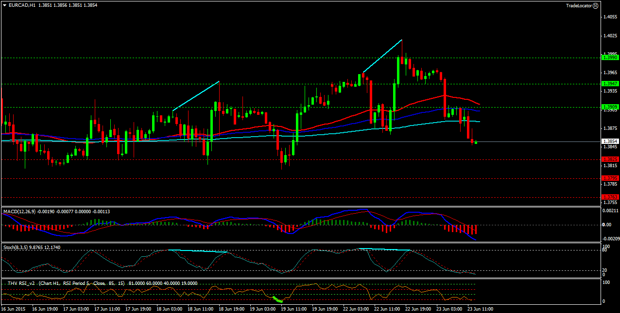 Пара EUR/CAD H1. Индикатор MACD -находится в отрицательной зоне и поддерживает продажи. Индикатор стохастик -находится возле зоны перепроданности и пока поддерживает продажи. Индикатор RSI-так же поддерживает продажи. Северные цели: сопротивление -1(1.3936), сопротивление-2(1.3973), сопротивление-3(1.4034). Южные цели: поддержка-1(1.3815), поддержка-2(1.3778), поддержка-3(1.3718). Цена торгуется в нисходящем канале,ниже скользящих средних(ЕМА) с периодами (50,100,200) и ниже пивота.