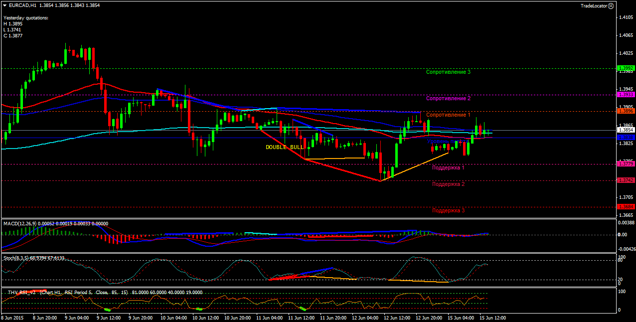Пара EUR/CAD H1. Индикатор MACD -находится в положительной зоне и поддерживает покупки. Индикатор стохастик -находится возле зоны перекупленности и поддерживает покупки. Индикатор RSI-так же поддерживает покупки. Северные цели: сопротивление -1(1.3896), сопротивление-2(1.3933), сопротивление-3(1.3992). Южные цели: поддержка-1(1.3779), поддержка-2(1.3742), поддержка-3(1.3684). Цена торгуется в восходящем канале,выше скользящих средних(ЕМА) с периодами (50,100,200) и выше пивота.