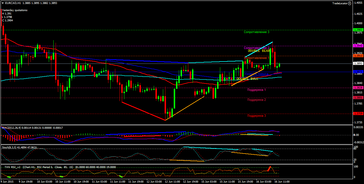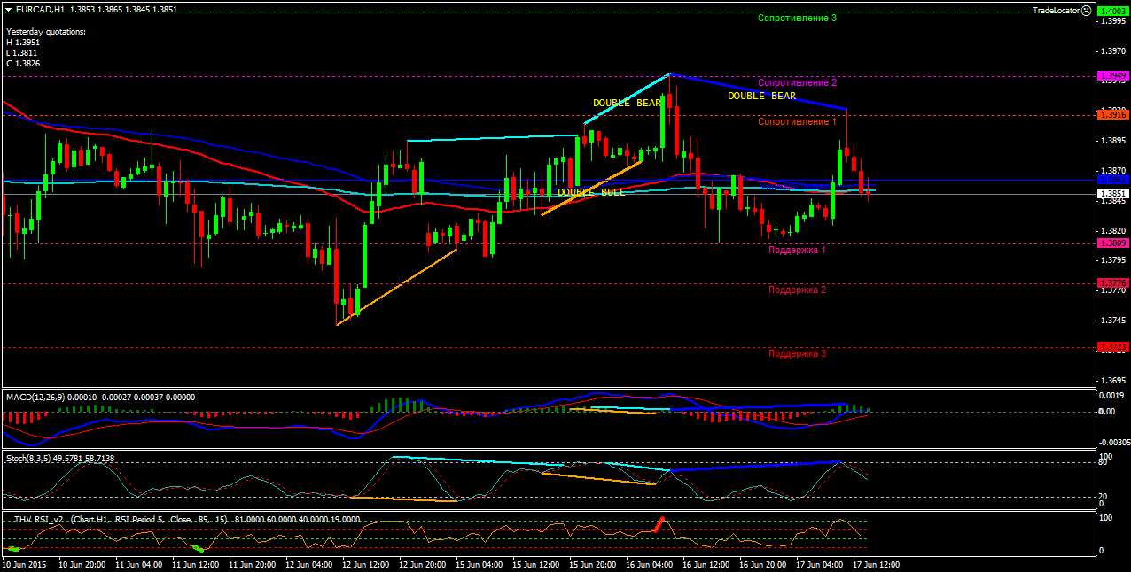 Пара EUR/CAD H1. Индикатор MACD -находится в положительной зоне,но подаёт сигнал на продажи. Индикатор стохастик -направлен к зоне перепроданности и поддерживает продажи. Индикатор RSI-так же поддерживает продажи. Северные цели: сопротивление -1(1.3906), сопротивление-2(1.3932), сопротивление-3(1.3973). Южные цели: поддержка-1(1.3824), поддержка-2(1.3798), поддержка-3(1.3757). Цена торгуется в восходящем канале,ниже скользящих средних(ЕМА) с периодами (50,100,200) и ниже пивота.
