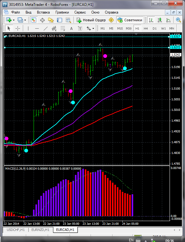 В связи с тем что по паре EUR\CAD торговля ведется выше ЕМА 24.10.50. дополнительный индикатор выше нулевой линии с показанием на повышение а основной индикатор дает сигнал на покупку. судя по показаний на рынке торговлю ведут быки которые ведут торговлю на север. по пути следования сильный уровень фрактала и закрепление цены выше этого уровня означает дальнейшее движение на север до уровня 1.4924. Прикрепленные файлы: