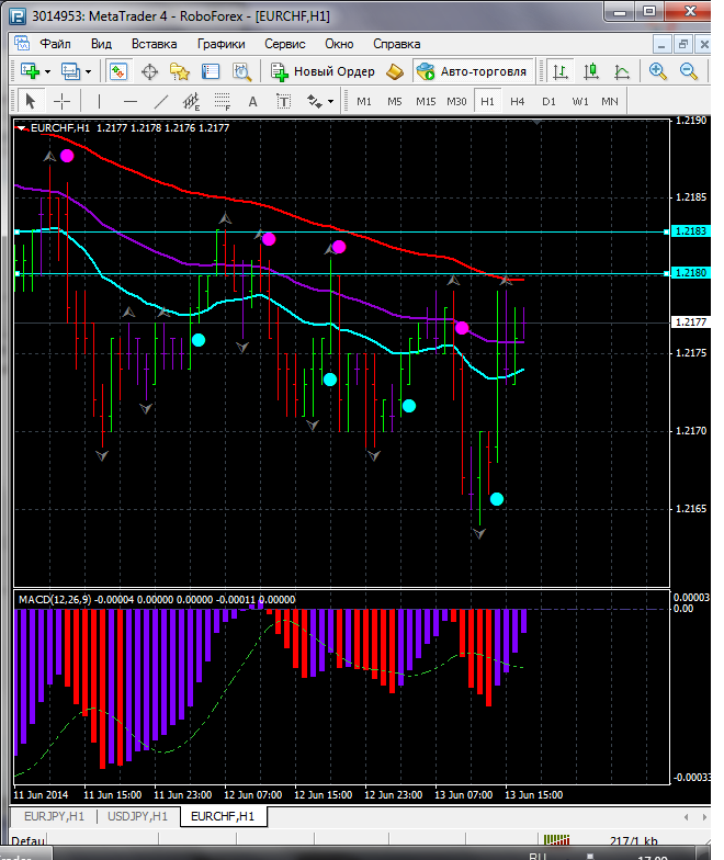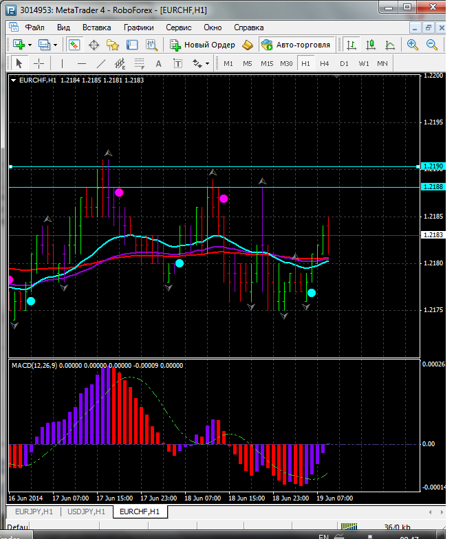 На данном тайфреме по паре EUR\CHF торговля ведется между ЕМА 100.50. дополнительный индикатор ниже нулевой линии с показанием на повышение а основной индикатор дает сигнал на покупку судя по показаний на рынке торговлю ведут быки которые продвигают цену на север. по пути следования сильный уровень фрактала и закрепление цены выше этого уровня означает дальнейшее движение на север до уровня 1.2183. Прикрепленные файлы: