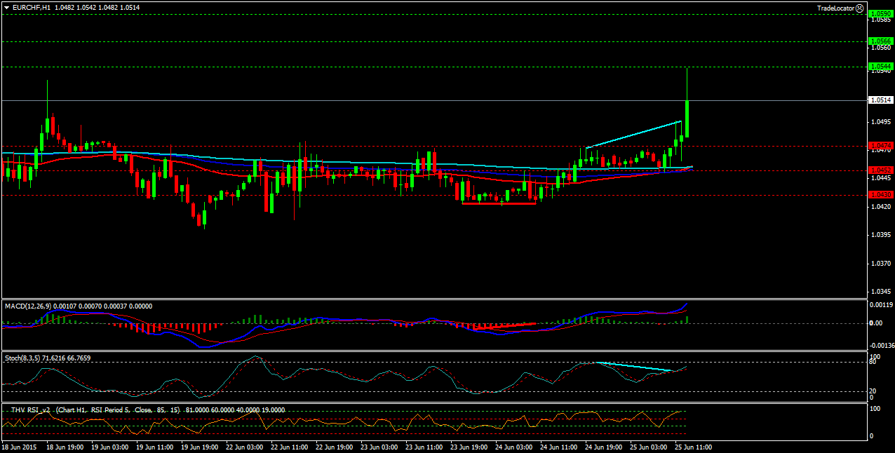 Пара EUR/CHF H1. Индикатор MACD -находится в положительной зоне и поддерживает покупки. Индикатор стохастик -направлен к зоне перекупленности и так же поддерживает покупки. Индикатор RSI-поддерживает покупки. Северные цели: сопротивление -1(1.0544), сопротивление-2(1.0566), сопротивление-3(1.0590). Южные цели: поддержка-1(1.0474), поддержка-2(1.0452), поддержка-3(1.0430). Цена торгуется в боковом канале,выше скользящих средних(ЕМА) с периодами (50,100,200).