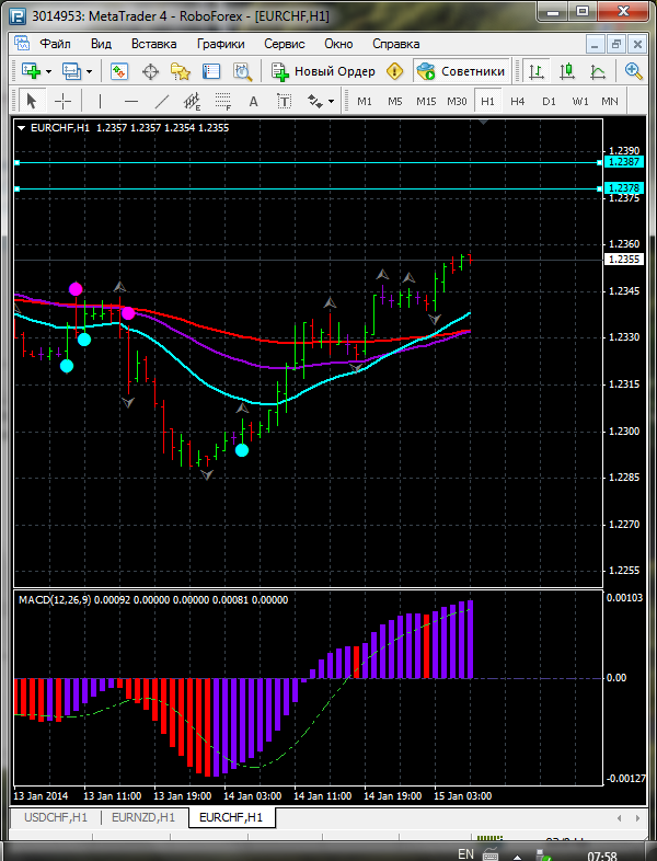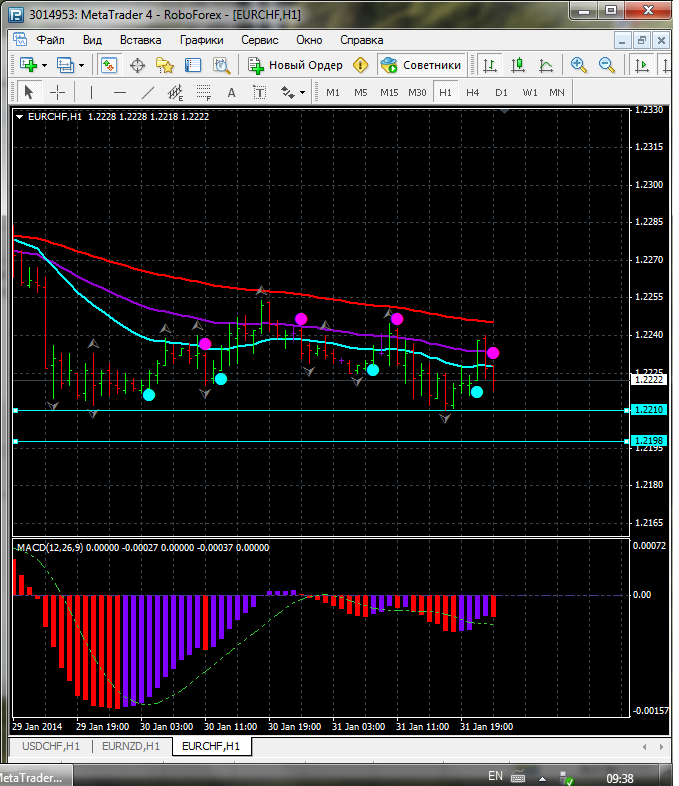 На данный момент по паре EUR\CHF торговля закрылась ниже ЕМА 100.50.24. дополнительный индикатор ниже нулевой линии с показанием на понижение а основной индикатор дает сигнал на продажу. судя по показаний на рынке торговлю ведут медведи которые продвигают цену на юг. по пути следования сильный уровень фрактала и закрепление цены ниже этого уровня означает дальнейшее движение на юг до уровня 1.2198. Прикрепленные файлы: