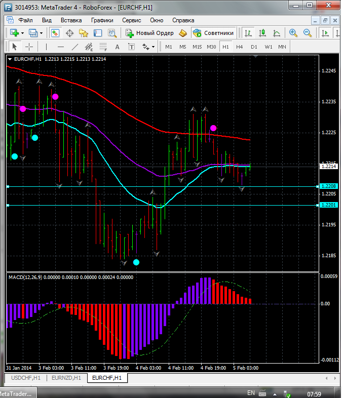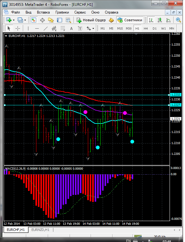 На данный момент по паре EUR\CHF торговля ведется между ЕМА 24.50. дополнительный индикатор выше нулевой линии с показанием на понижение а основной индикатор дает сигнал на продажу. судя по показаний на рынке торговлю ведут медведи которые продвигают цену на юг. по пути следования сильный уровень фрактала и закрепление цены ниже этого уровня означает дальнейшее движение на юг до уровня 1.2195. Прикрепленные файлы: