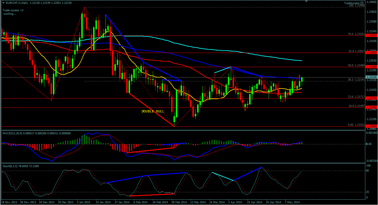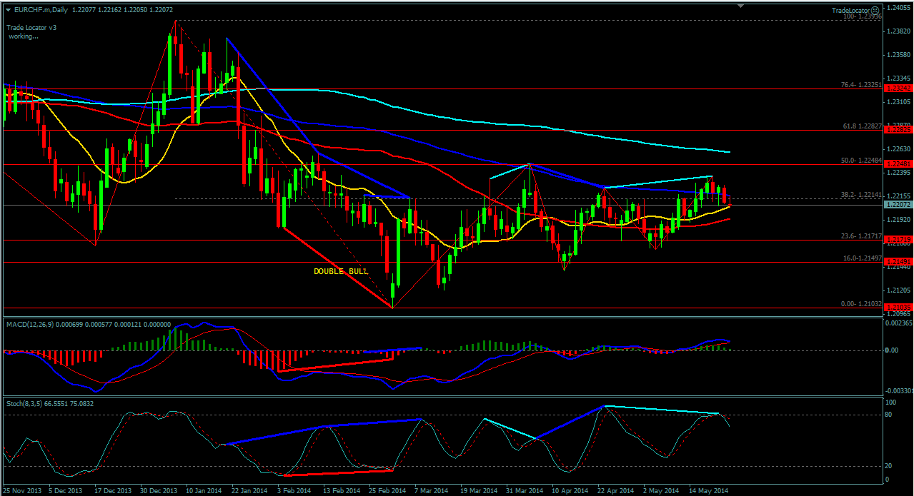 На сегодня по паре EUR\CHF торговля ведется между ЕМА 24.50. дополнительный индикатор ниже нулевой линии с показанием на понижение а основной индикатор дает сигнал на продажу. судя по показаний на рынке торговлю ведут медведи которые продвигают цену на юг. по пути следования сильный уровень фрактала и за крепление цены ниже этого уровня означает дальнейшее движение на юг до уровня 1.2202. Прикрепленные файлы: