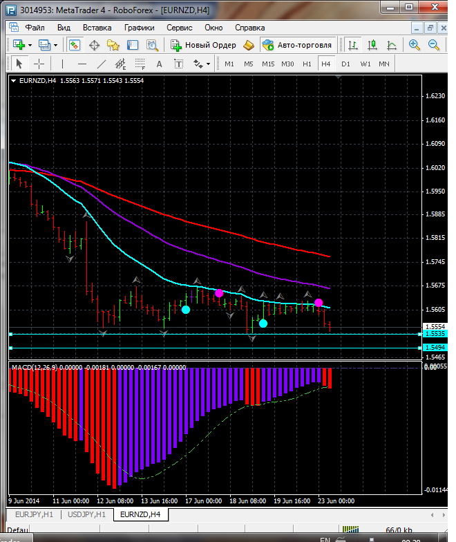 Исходя из того что по паре EUR\NZD торговля ведется ниже ЕМА 100.50.24. дополнительный индикатор ниже нулевой линии с показанием на понижение а основной индикатор дает сигнал на продажу. судя по показаний на рынке торговлю ведут медведи которые продвигают цену на юг. по пути следования сильный уровень фрактала и закрепление цены ниже этого уровня означает дальнейшее движение на юг до уровня 1.5494. Прикрепленные файлы: