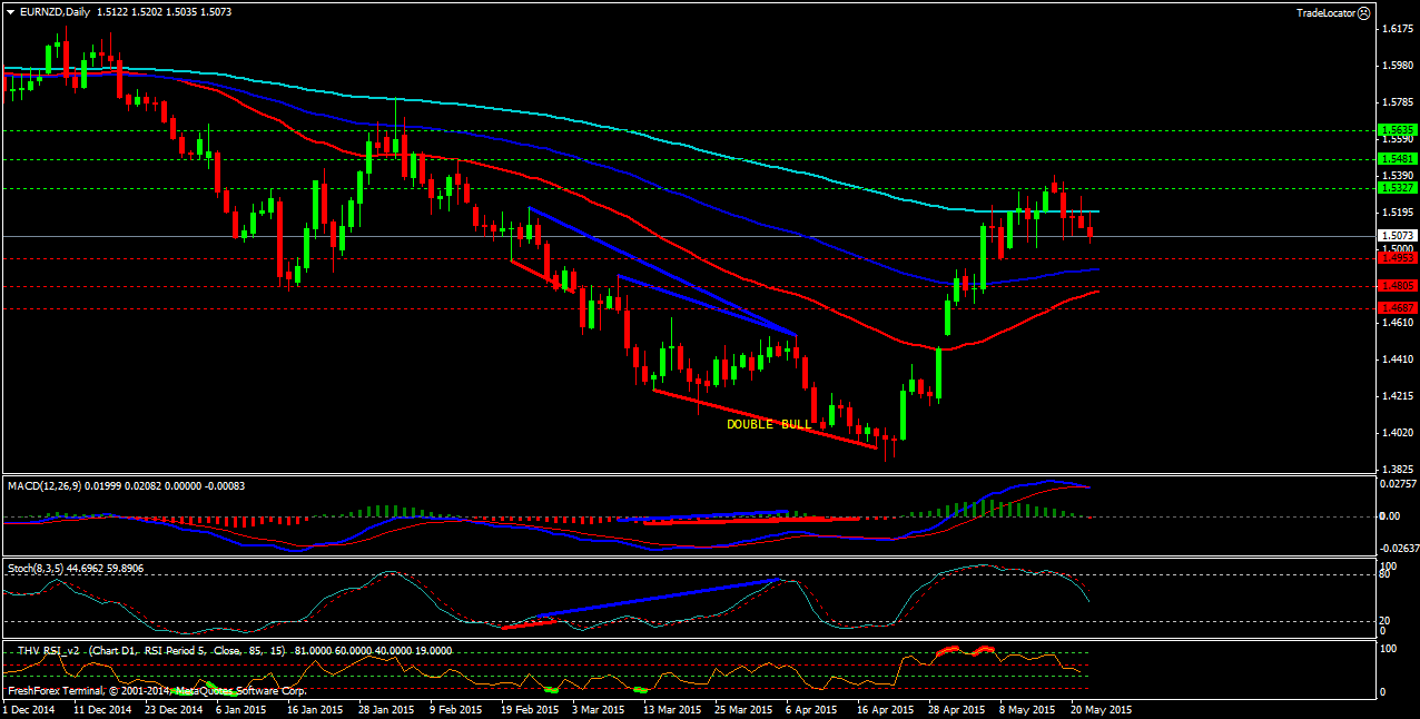 Пара EUR/NZD D1. Индикатор MACD - находится в положительной зоне,но подаёт сигнал на продажу. Индикатор стохастик -направлен к зоне перепроданности и поддерживает продажи. Индикатор RSI-та же поддерживает продажи. Северные цели: сопротивление -1(1.5327), сопротивление-2(1.5481), сопротивление-3(1.5635). Южные цели: поддержка-1(1.4953), поддержка-2(1.4805), поддержка-3(1.4687). Цена торгуется в нисходящем канале,выше скользящих средних(ЕМА) с периодами (50,100).