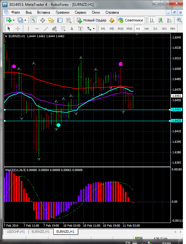 На данный момент по паре EUR\NZD торговля закрылась ниже ЕМА 100.50.24. дополнительный индикатор ниже нулевой линии с показанием на понижение а основной индикатор дает сигнал на продажу. судя по показаний на рынке торговлю ведут медведи которые продвигают цену на юг. по пути следования сильный уровень фрактала и закрепление цены ниже этого уровня означает дальнейшее движение на юг до уровня 1.6352. Прикрепленные файлы: