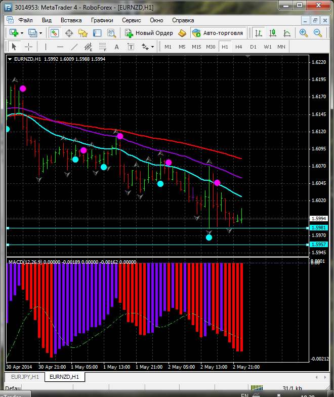 Исходя из того что по паре EUR\NZD торговля закрылась между ЕМА 100.24. дополнительный индикатор выше нулевой линии с показанием на понижение а основной индикатор дает сигнал на продажу. судя по показаний на рынке торговлю ведут медведи которые продвигают цену на юг. по пути следования сильный уровень фрактала и закрепление цены ниже этого уровня означает дальнейшее движение на юг до уровня 1.5820. Прикрепленные файлы: