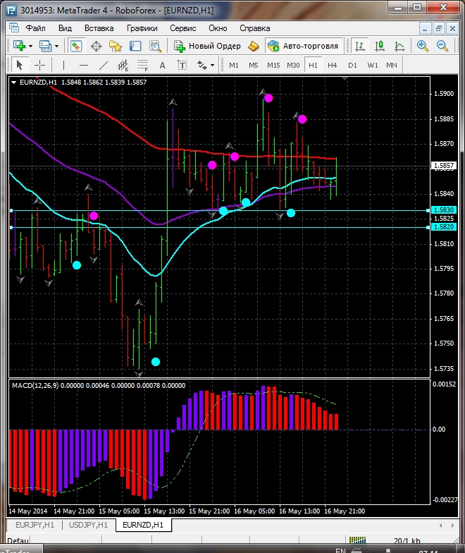 На данном тайфреме по паре EUR\NZD торговля ведется ниже ЕМА 100.50.24. дополнительный индикатор ниже нулевой линии с показанием на повышение а основной индикатор дает сигнал на покупку. судя по показаний на рынке торговлю ведут быки которые продвигают цену на север. по пути следования сильный уровень фрактала и закрепление цены выше этого уровня означает дальнейшее движение на север до уровня 1.5992. Прикрепленные файлы: