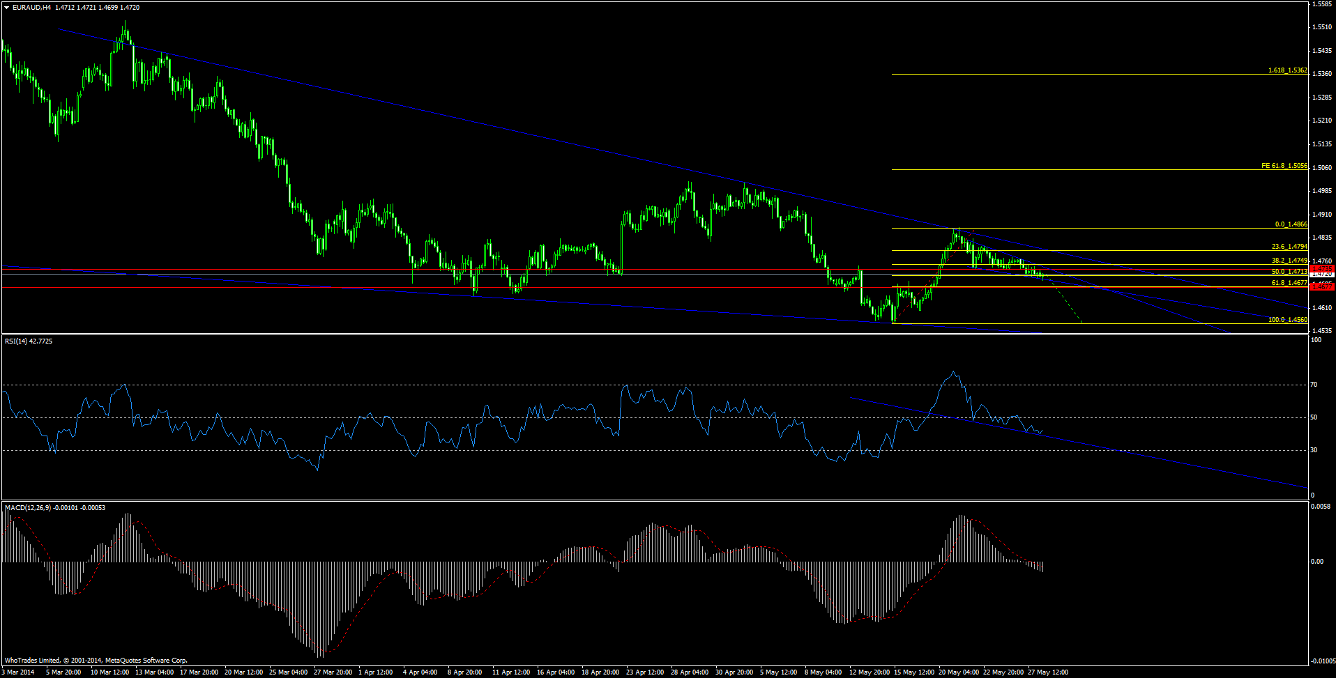 По валютной паре евро австралиец сформировался нисходящий канал, в пределах которого цена пока находится. После коррекции и на отскоке от линии сопротивления которого + от 23% фибо, а также после пробоя минимума 1.4365, ждем продолжение нисходящего тренда. После пробоя линии сопротивления канала, на ретесте, вероятно, коррекция продолжится к 38 или 61% фибо.