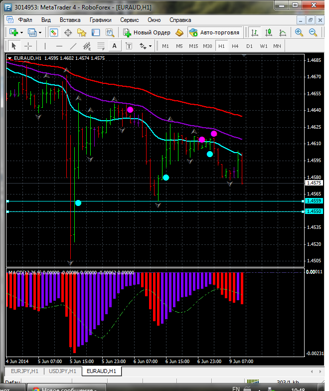 В связи с тем что по паре EUR\AUD торговля ведется ниже ЕМА 100.50.24. дополнительный индикатор ниже нулевой линии с показанием на понижение а основной индикатор дает сигнал на продажу. судя по показаний на рынке торговлю ведут медведи которые продвигают цену на юг. по пути следования сильный уровень фрактала и закрепление цены ниже этого уровня означает дальнейшее движение на юг до уровня 1.4550. Прикрепленные файлы: