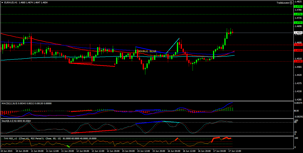 Пара EUR/AUD H1. Индикатор MACD -находится в положительной зоне,но подаёт сигнал на продажи. Индикатор стохастик -входит в зону перепроданности и поддерживает продажи. Индикатор RSI-так же поддерживает продажи. Северные цели: сопротивление-1(1.4684), сопротивление-2(1.4731), сопротивление-3(1.4809). Южные цели: поддержка-1(1.4528), поддержка-2(1.4481), поддержка-3(1.4403). Цена торгуется в восходящем канале,ниже скользящих средних(ЕМА) с периодами (50,100) и ниже пивота.