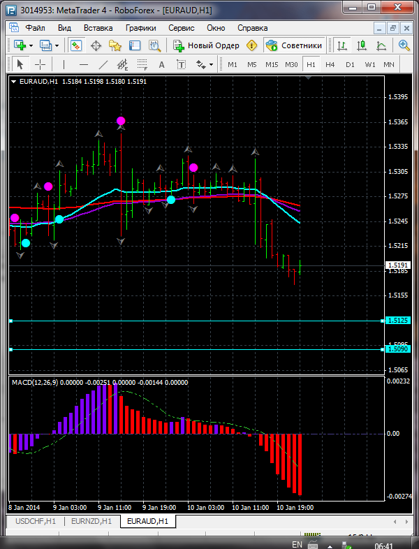 На данный момент по паре EUR\AUD торговля ведется выше ЕМА 24.100.50. дополнительный индикатор выше нулевой линии с показанием на повышение а основной индикатор дает сигнал на продажу. судя по показаний на рынке торговлю ведут быки которые продвигают цену на север. по пути следования сильный уровень фрактала и закрепление цены выше этого уровня означает дальнейшее движение на север до уровня 1.5354. Прикрепленные файлы: