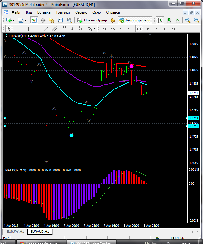 На данный момент по паре EUR\AUD торговля ведется ниже ЕМА 100.50.24. дополнительный индикатор выше нулевой линии с показанием на понижение а основной индикатор дает сигнал на продажу. судя по показаний на рынке торговлю ведут медведи которые продвигают цену на юг. по пути следования сильный уровень фрактала и закрепление цены ниже этого уровня означает дальнейшее движение на юг до уровня 1.4741. Прикрепленные файлы: