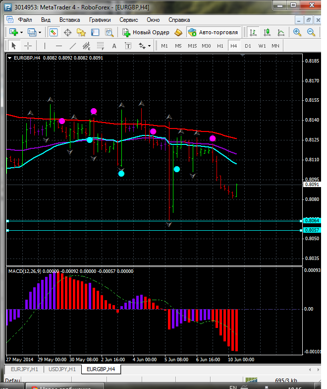 На данный момент по паре EUR\GBP торговля ведется ниже ЕМА 100.50.24. дополнительный индикатор ниже нулевой линии с показанием на понижение а основной индикатор дает сигнал на продажу. судя по показаний на рынке торговлю ведут медведи которые продвигают цену на юг. по пути следования сильный уровень фрактала и закрепление цены ниже этого уровня означает дальнейшее движение на юг до уровня 0.8044. |
