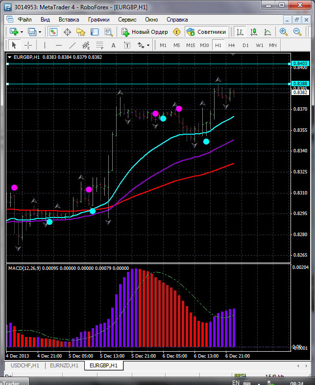 На данном тайфреме по паре EUR\GBP торговля ведется выше ЕМА 24.50.100. дополнительный индикатор выше нулевой линии с показанием на повышение а основной индикатор дает сигнал на покупку. судя по показаний на рынке торговлю ведут быки которые продвигают цену на север. по пути следования сильный уровень фрактала и закрепление цены выше этого уровня означает дальнейшее движение на север до уровня 0.8396. Прикрепленные файлы: