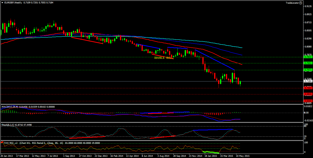 Пара EUR/GBP WEEKLY. Индикатор MACD - находится в отрицательной зоне и поддерживает продажи. Индикатор стохастик -направлен к зоне перепроданности и так же поддерживает продажи. Индикатор RSI-поддерживает продажи. Северные цели: сопротивление -1(0.7473), сопротивление-2(0.7653), сопротивление-3(0.7815). Южные цели: поддержка-1(0.7003), поддержка-2(0.6840), поддержка-3(0.6665). Цена торгуется в нисходящем канале,ниже скользящих средних(ЕМА) с периодами (50,100,200).