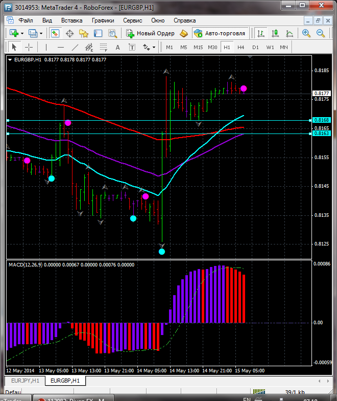 В связи с тем что по паре EUR\GBP торговля ведется выше ЕМА 24.50.100. дополнительный индикатор выше нулевой линии с показанием на понижение а основной индикатор дает сигнал на продажу. судя по показаний на рынке торговлю ведут медведи которые продвигают цену на юг. по пути следования сильный уровень фрактала и закрепление цены ниже этого уровня означает дальнейшее движение на юг до уровня 0.8163. Прикрепленные файлы: