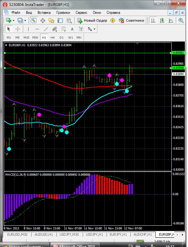 На данном тайфреме по паре EUR\GBP торговля ведется выше ЕМА 100.24.50 дополнительный индикатор выше нулевой линии с показанием на повышение а основной индикатор дает сигнал на покупку. судя по показаний на рынке торговлю ведут быки которые продвигают цену на север. по пути следования сильный уровень фрактала и закрепление цены выше этого уровня и означает дальнейшее движение на север до уровня 0.84081. Прикрепленные файлы: