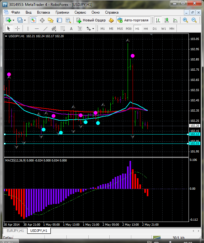 В связи с тем что по паре USD\JPY торговля ведется между ЕМА 24.50. дополнительный индикатор выше нулевой линии с показанием на понижение а основной индикатор дает сигнал на продажу. судя по показаний на рынке торговлю ведут медведи которые продвигают цену на юг. по пути следования сильный уровень фрактала и закрепление цены ниже этого уровня означает дальнейшее движение на юг до уровня 102.07. Прикрепленные файлы: