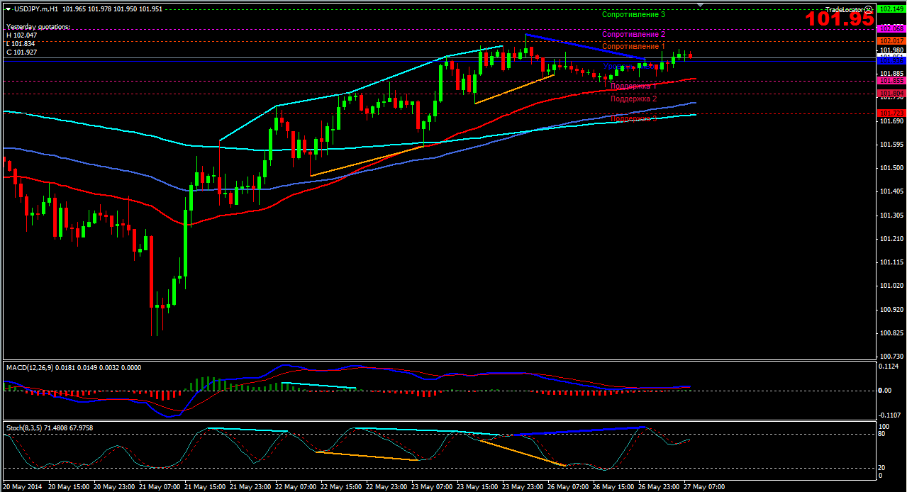 На сегодня по паре USD\JPY торговля ведется выше ЕМА 24.50.100. дополнительный индикатор выше нулевой линии с показанием на повышение а основной индикатор дает сигнал на покупку. судя по показаний на рынке торговлю ведут быки которые продвигают цену на север. по пути следования сильный уровень фрактала и закрепление цены выше этого уровня означает дальнейшее движение на север до уровня 102.57. Прикрепленные файлы: