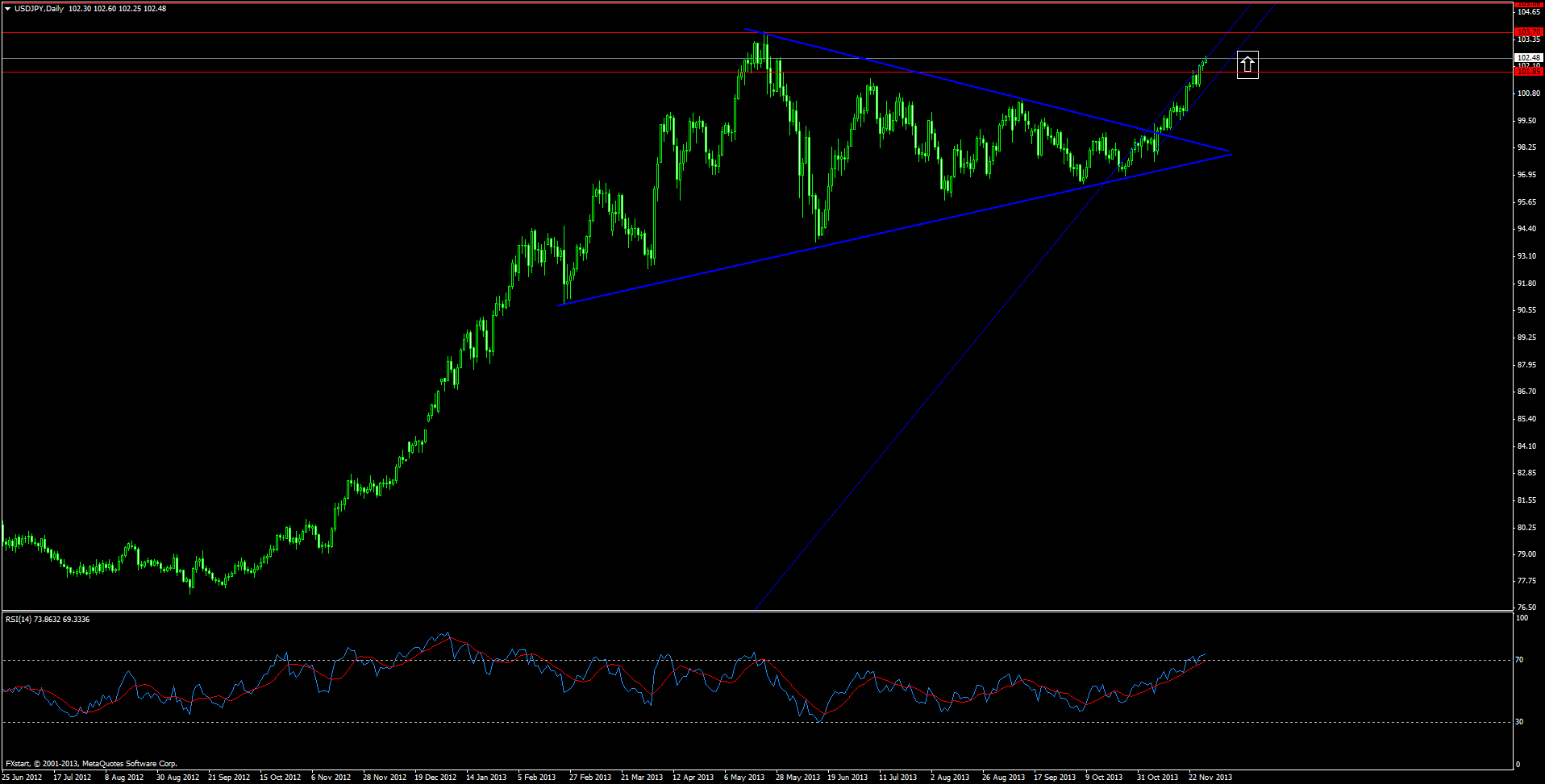 Пара доллар США японская йена, прорвав треугольник, продолжает свой рост. На сегодня пара достигла своей первой цели 102.50. При закреплении выше этого уровня ожидаю рост до уровня 103.70, либо отскок на коррекцию до 100-го уровня Прикрепленные файлы: