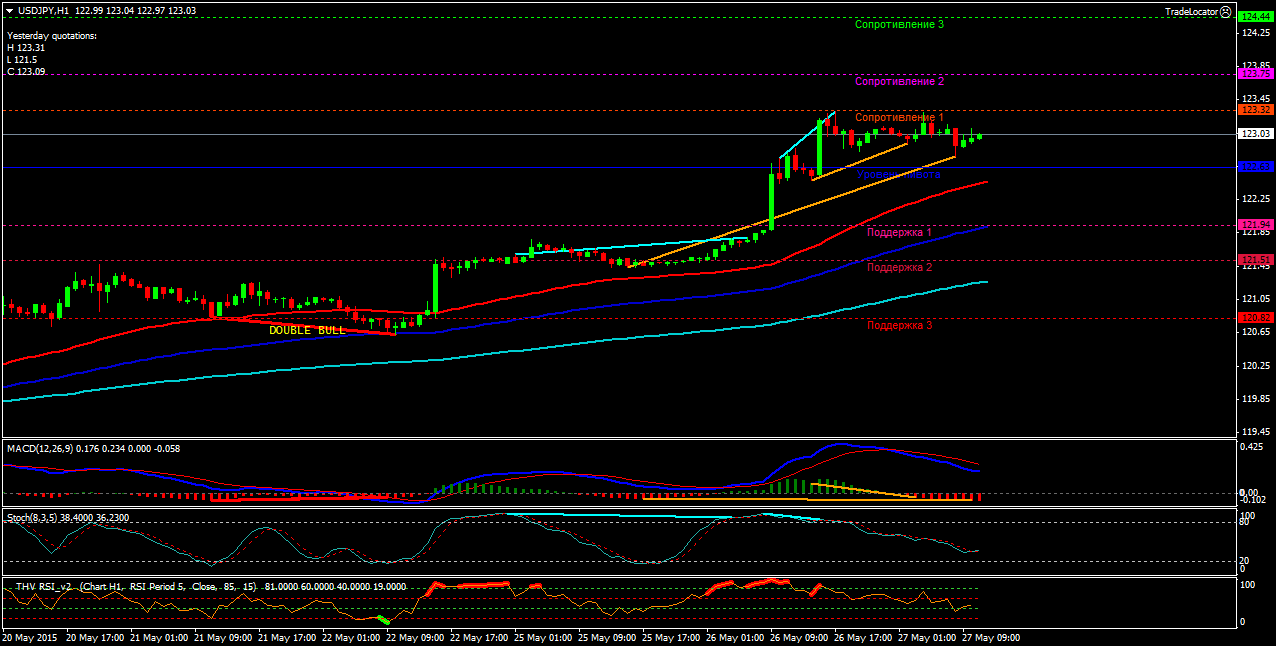 Пара USD/JPY H1. Индикатор MACD - находится в положительной зоне и поддерживает покупки. Индикатор стохастик -находится между зонами 20-80 и не подаёт чётких сигналов. Индикатор RSI-так же не подаёт чётких сигналов. Северные цели: сопротивление -1(123.99), сопротивление-2(124.29), сопротивление-3(124.79). Южные цели: поддержка-1(123.00), поддержка-2(122.70), поддержка-3(122.21). Цена торгуется в восходящем канале,выше скользящих средних(ЕМА) с периодами (50,100,200) и выше пивота.