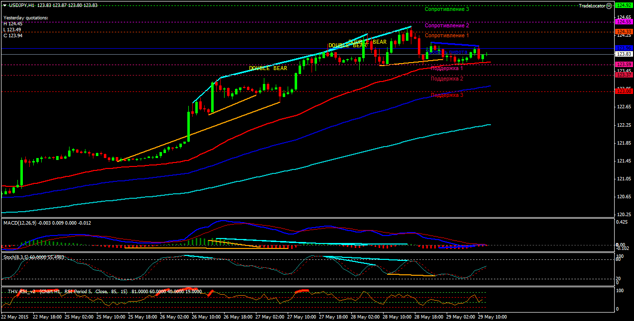 Пара USD/JPY H1. Индикатор MACD - находится в нейтральной зоне и не подаёт чётких сигналов. Индикатор стохастик -направлен к зоне перекупленности и поддерживает покупки. Индикатор RSI-так же поддерживает покупки. Северные цели: сопротивление -1(124.33), сопротивление-2(124.55), сопротивление-3(124.92). Южные цели: поддержка-1(123.59), поддержка-2(123.37), поддержка-3(123.00). Цена торгуется в восходящем канале,выше скользящих средних(ЕМА) с периодами (50,100,200).