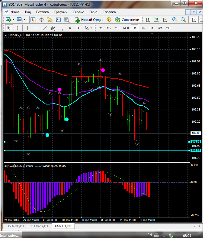 По паре USD\JPY на данный момент торговля ведется ниже ЕМА 100.50.24. дополнительный индикатор ниже нулевой линии с показанием на понижение а основной индикатор дает сигнал на продажу. судя по показаний на рынке торговлю ведут медведи которые продвигают цену на юг. по пути следования сильный уровень фрактала и закрепление цены ниже этого уровня означает дальнейшее движение на юг до уровня 101.28. Прикрепленные файлы:
