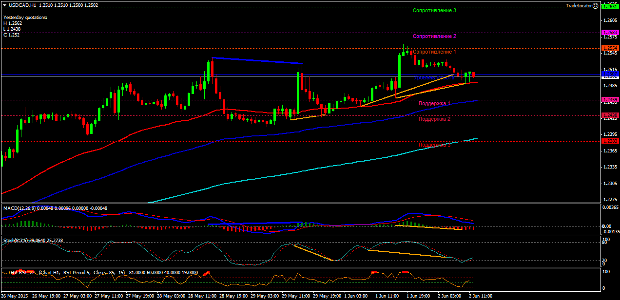 Пара USD/CAD H1. Индикатор MACD -находится в положительной зоне,но подаёт сигнал на продажи. Индикатор стохастик -направлен к зоне перепроданности и поддерживает продажи. Индикатор RSI-так же поддерживает продажи. Северные цели:сопротивление -1(1.2495), сопротивление-2(1.2524), сопротивление-3(1.2571). Южные цели: поддержка-1(1.2400), поддержка-2(1.2371), поддержка-3(1.2323). Цена торгуется в восходящем канале,ниже скользящих средних(ЕМА) с периодами (50,100) и ниже пивота.