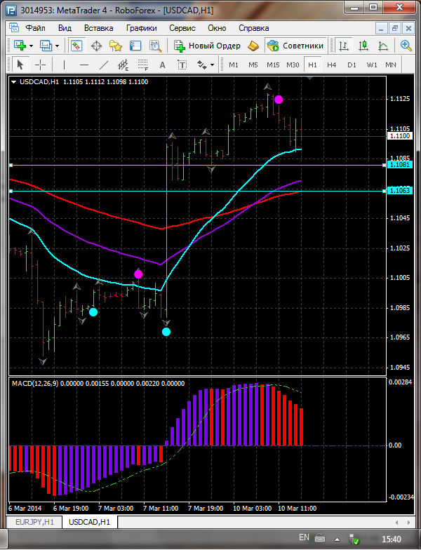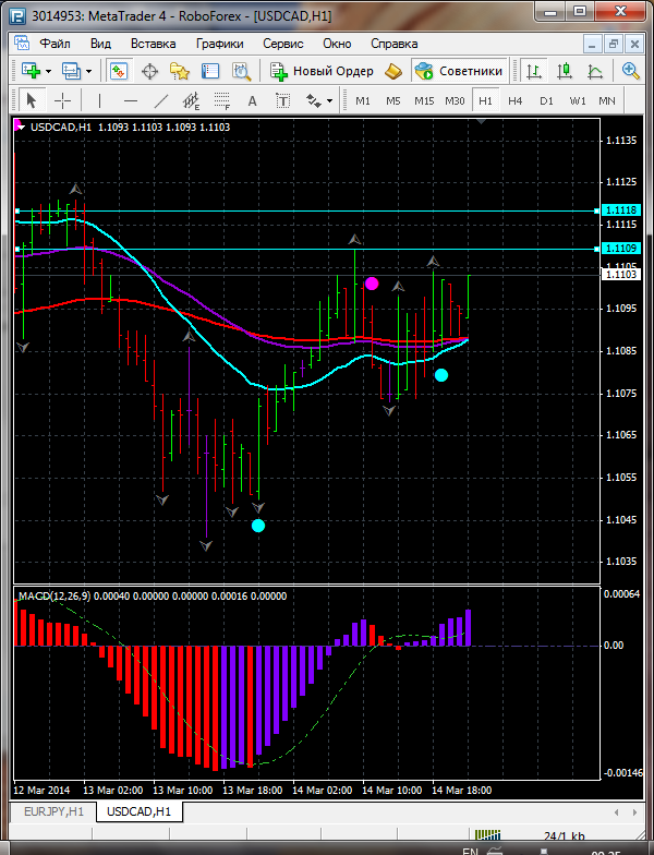 И сходя из того что по паре USD\CAD торговля ведется между ЕМА 50.24 дополнительный индикатор выше нулевой линии с показанием на понижение а основной индикатор дает сигнал на продажу судя по показаний на рынке торговлю ведут медведи которые ведут торговлю на юг. по пути следования сильный уровень фрактала и закрепление цены ниже этого уровня означает дальнейшее движение на юг до уровня 1.1059. Редактировалось: 1 раз (Последний: 4 марта 2014 в 10:53) | ||||