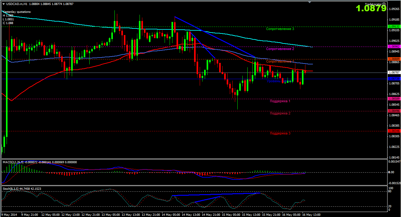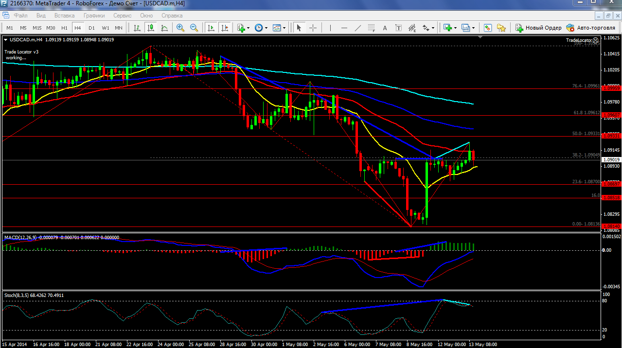 Пара USDCAD H4 торгуется в восходящем канале но ниже скользящих средних с периодами (14,50,100 и 200) Индикатор MACD-находиться в отрицательной зоне и подал сигнал на продажу.Индикатор стохастик-перешел в зону перепродонности и не подает четких сигналов. Северные цели -1.0978(фибо-38.2), -1.1006(фибо-23.6) и 1.1052 локальный максимум от 23.04.2014. Юхные цели -1.0932(фибо-61.8), -1.0903(фибо-76.4) и -1.0857 локальный минимум от 09.04.2014. Прикрепленные файлы: