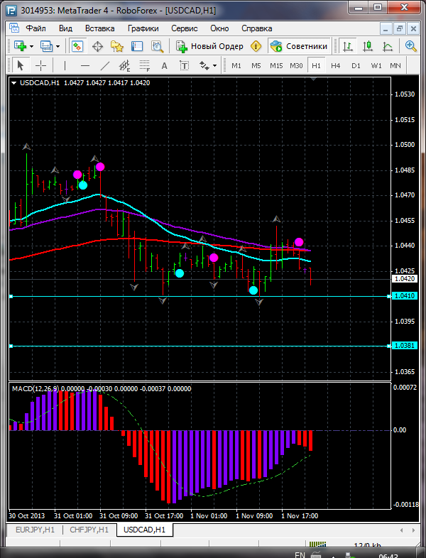 На данный момент по паре USD\CAD торговля ведется между ЕМА 24.50. дополнительный индикатор выше нулевой линии с показанием на понижение а основной индикатор дает сигнал на продажу.судя по показаний на рынке торговлю ведут медведи которые продвигают цену на юг. по пути следования сильный уровень фрактала и закрепление цены ниже этого уровня и означает дальнейшее движение на юг до уровня 1.0474. Прикрепленные файлы: