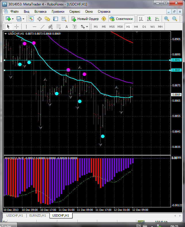 На сегодня по паре USD\CHF торговля ведется между ЕМА 50.24. дополнительный индикатор ниже нулевой линии с показанием на повышение а основной индикатор дает сигнал на покупку. судя по показаний на рынке торговлю ведут быки которые продвигают цену на север. по пути следования сильный уровень фрактала и закрепление цены выше этого уровня означает дальнейшее движение на север до уровня 0.8891. Прикрепленные файлы: