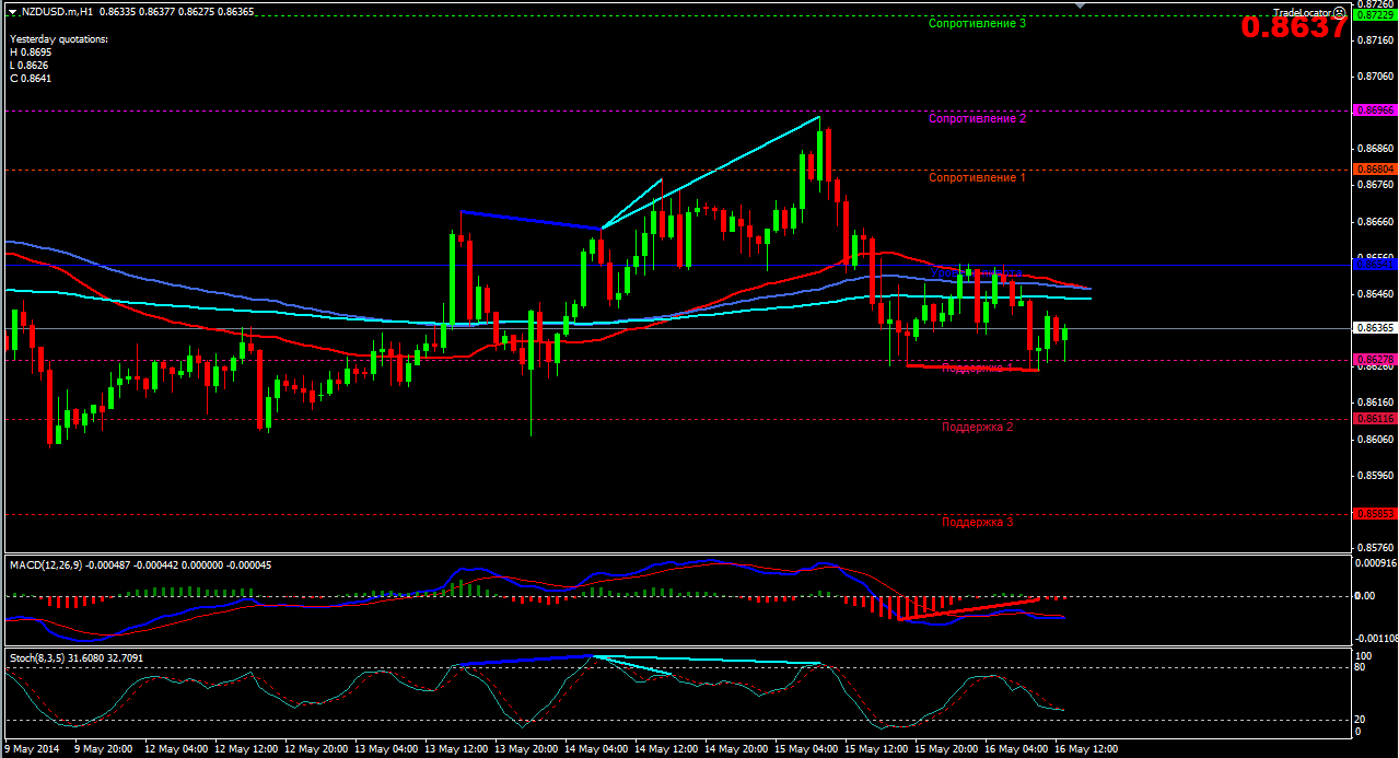 Пара NSD/USD H1 торгуется в низходящем канале,ниже скользящих средних с периодами (50,100,200) и ниже уровня пивота. Индикатор MACD - находится в отрицательной зон, но даёт сигнал на покупку. Индикатор стохастик - идет в направлении зоны перекупленности и так же поддерживает покупки . Северные цели: сопративление -1(0.8617), сопративление-2(0.8635), сопративление-3(0.8663) и -0.8695(локальный максимум от 15.05.2014). Южные цели: поддержка-2(0.8543), поддержка-3(0.8515) и поддержка-4(0.8478). Прикрепленные файлы: