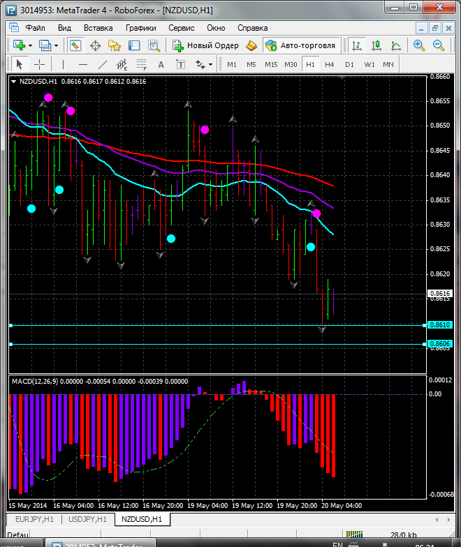 В связи с тем что по паре NZD\USD торговля ведется ниже ЕМА 100.50.24. дополнительный индикатор ниже нулевой линии с показанием на понижение а основной индикатор дает сигнал на продажу. судя по показаний на рынке торговлю ведут медведи которые продвигают цену на юг. по пути следования сильный уровень фрактала и закрепление цены ниже этого уровня означает дальнейшее движение на юг до уровня 0.8606. Прикрепленные файлы: