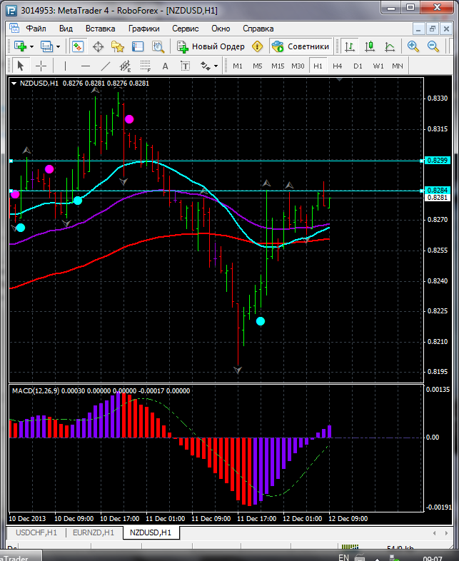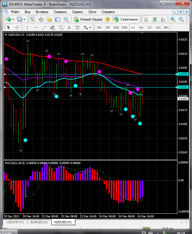 На часовой период времени по паре NZD\USD торговля ведется ниже ЕМА 100.50.24. дополнительный индикатор ниже нулевой линии с показанием на повышение а основной индикатор дает сигнал на покупку. судя по показаний на рынке торговлю ведут быки которые продвигают цену на север.по пути следования сильный уровень фрактала и закрепление цены выше этого уровня означает дальнейшее движение на север до уровня 0.8200. Прикрепленные файлы: