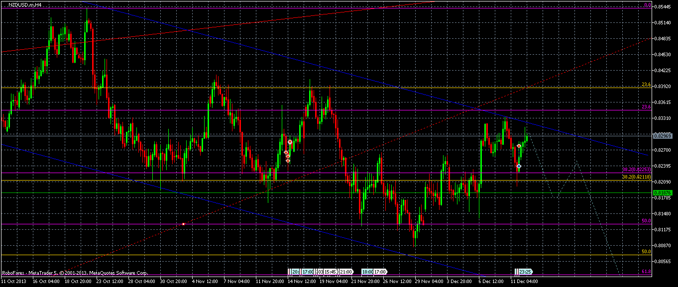 По паре новозеландец доллар сформировался восходящий канал, в котором пара продолжает находится. На отскоке от линии поддержки канала, вероятно, пара направится вверх. После пробоя этого уровня, ждем подхода цены к 0.8082. После роста и на отскоке от линии сопротивления голубой + от 38% фибо, пара продолжит падение. И только после пробоя голубой линии сопротивления, вероятность подхода цены к 0.8333 - увеличивается.