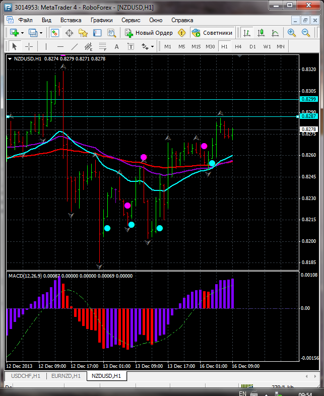 На данном тайфреме по паре NZD\USD торговля ведется выше ЕМА 24.50.100. дополнительный индикатор выше нулевой линии с показанием на повышение а основной индикатор дает сигнал на покупку. судя по показаний на рынке торговлю ведут быки которые продвигают цену на север. по пути следования сильный уровень фрактала и закрепление цены выше этого уровня означает дальнейшее движение на север до уровня 0.8299. Прикрепленные файлы:
