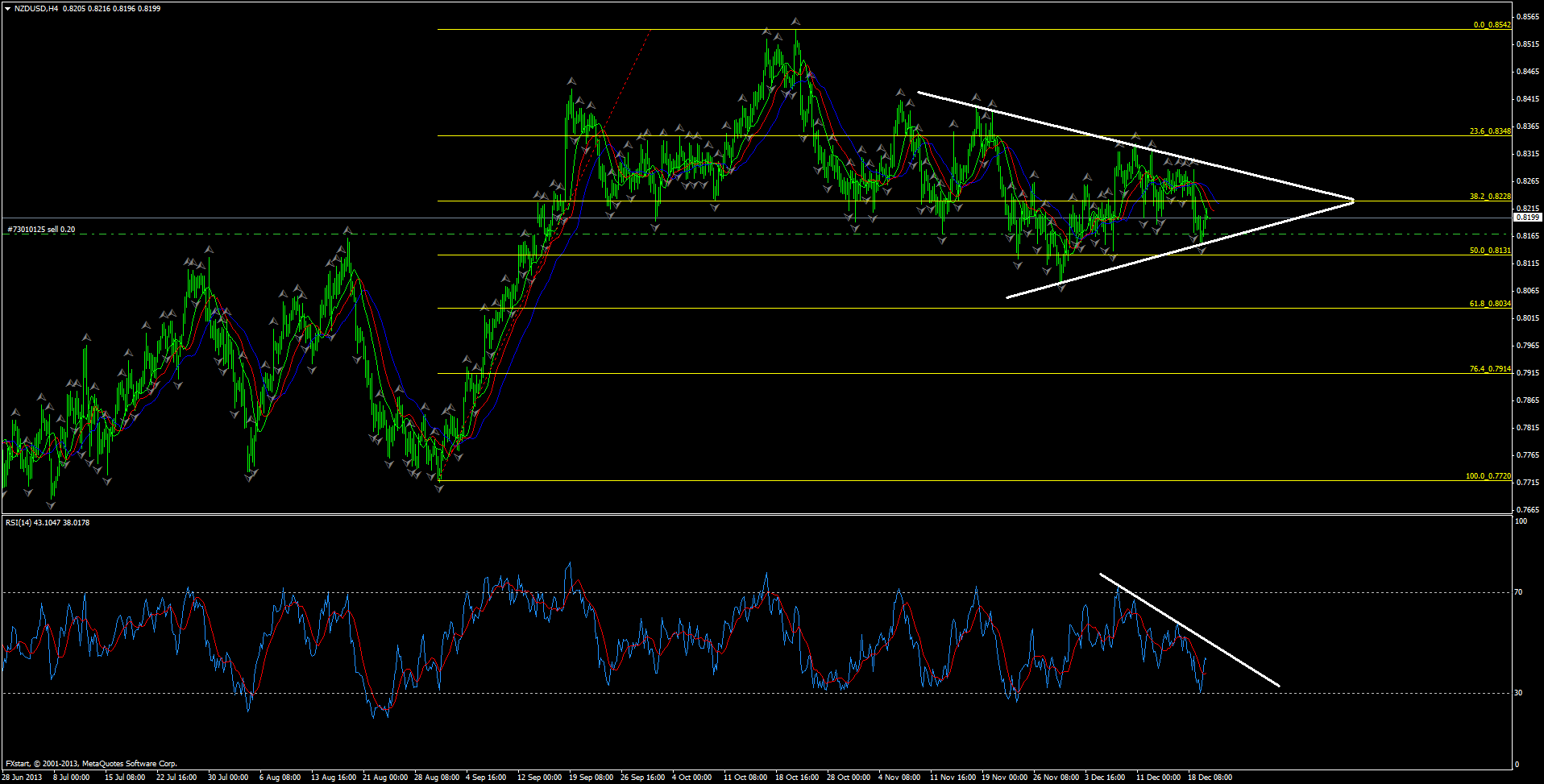Киви находится у верхней границы нисходящего канала, что может стать причиной отбоя от этого уровня и снижение ее в ближайшие месяцы вниз до 0.7950 там находится 61.8 % фибо коррекции, но в долгосрочной преспективе киви будет расти так как РНБЗ заявил что" прогнозы показывают, ставку необходимо увеличить приблизительно на 2.25 процента в течение следующих 2-х с небольшим лет Прикрепленные файлы: