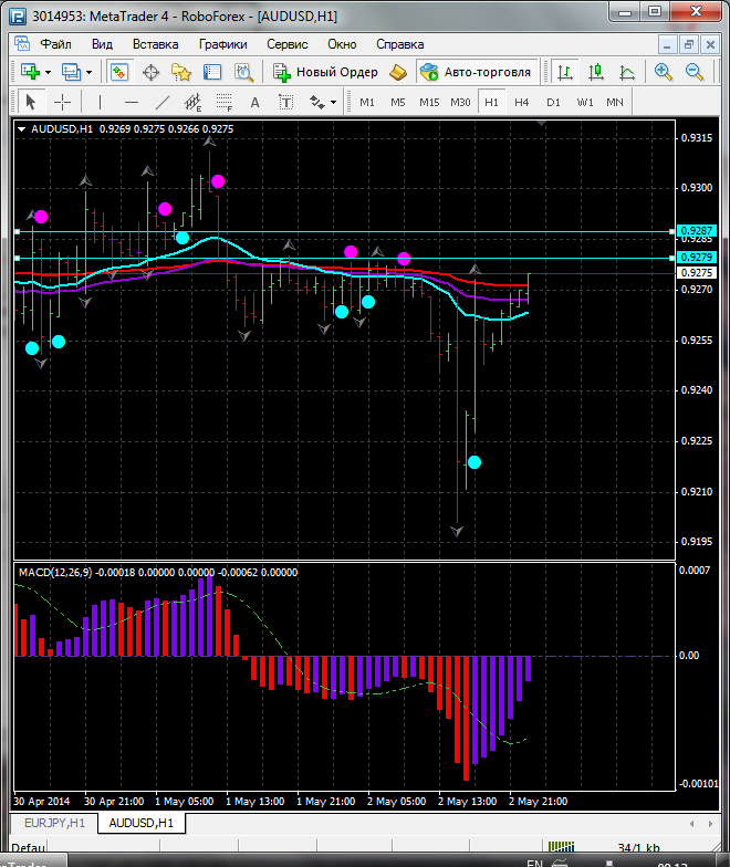 На сегодня по паре AUD\USD торговля ведется выше ЕМА 24.50.100. дополнительный индикатор выше нулевой линии с показанием на повышение о основной индикатор дает сигнал на покупку. судя по показаний на рынке торговлю ведут быки которые продвигают цену на север. по пути следования сильный уровень фрактала и закрепление цены выше этого уровня означает дальнейшее движение на север до уровня 0.9325. Прикрепленные файлы: