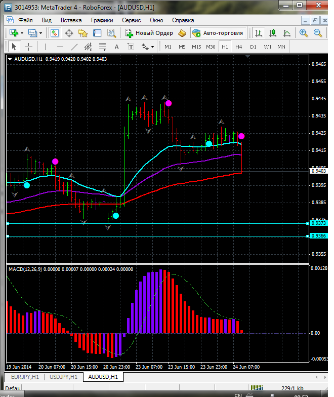 Исходя из того что по паре AUD\USD торговля ведется ниже ЕМА 50.24.100. дополнительный индикатор ниже нулевой линии с показанием на понижение а основной индикатор дает сигнал на продажу. судя по показаний на рынке торговлю ведут медведи которые продвигают цену на юг. по пути следования сильный уровень фрактала и закрепление цены ниже этого уровня означает дальнейшее движение на юг до уровня 0.9312. Прикрепленные файлы:
