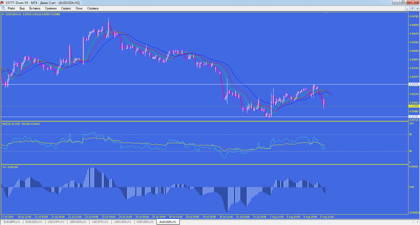 Валютная пара наметила нисходящее движение, Alligator показывает на снижение, RSI и AO снижаются. Поэтому по этой паре можно ожидать хорошего движения вниз, как только рынок поймет, что по этой паре сегодня не было такой динамике как в других. Поэтому ближайшим уровнем сопротивления служит 0,9278. разворот же пары возможен при прорыве поддержки 0,9345, что по текущим рыночным условиям маловероятно.