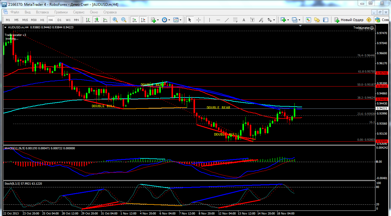 На сегодня по паре AUD\USD торговля ведется между ЕМА 24.50 100.дополнительный индикатор выше нулевой линии с показанием на понижение а основной индикатор дает сигнал на продажу .судя по показаний на рынке торговлю ведут медведи которые продвигают цену на юг. по пути следования сильный уровень фрактала и закрепление цены ниже этого уровня и означает дальнейшее движение на юг до уровня 0.9384. Прикрепленные файлы: