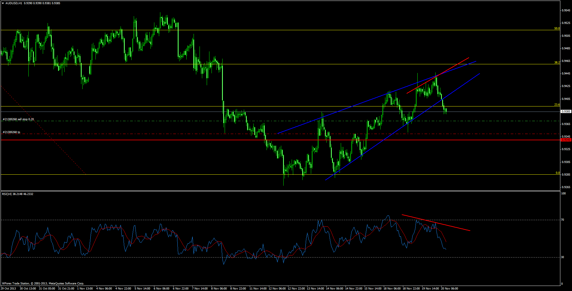 Пара австралиец доллар США пытается пробить восходящий клин вниз. В настоящий момент пара пробила 23-й фибоуровень и закрепляется ниже линии пробития. На индикаторе RSI наблюдается дивергенция. Если сегодняшние новости из США не смажут картину - то буду ожидать снижения к первой цели 0.9340 Прикрепленные файлы: