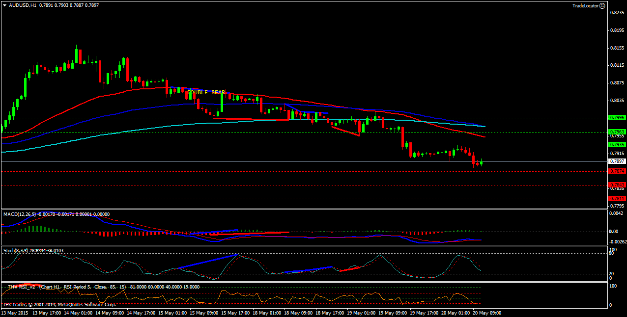 Пара AUD/USD H1. Индикатор MACD - находится в отрицательной зоне и поддерживает продажи. Индикатор стохастик -находится возле зоны перекупленности и формирует сигнал на продажи. Индикатор RSI-не подаёт чётких сигналов. Северные цели: сопротивление -1(0.7900), сопротивление-2(0.7928), сопротивление-3(0.7974). Южные цели: поддержка-1(0.7807), поддержка-2(0.7779), поддержка-3(0.7732). Цена торгуется в нисходящем канале,ниже скользящих средних(ЕМА) с периодами (50,100,200) и ниже пивота.