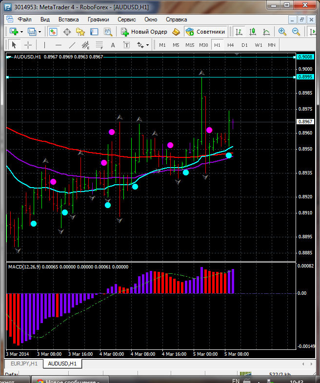 На сегодня по паре AUD\USD торговля закрылась между ЕМА 24.50. дополнительный индикатор ниже нулевой линии с показанием на понижение а основной индикатор дает сигнал на продажу. судя по показаний на рынке торговлю ведут медведи которые продвигают цену на юг. по пути следования сильный уровень фрактала и закрепление цены ниже этого уровня означает дальнейшее движение на юг до уровня 0.8986. Прикрепленные файлы: