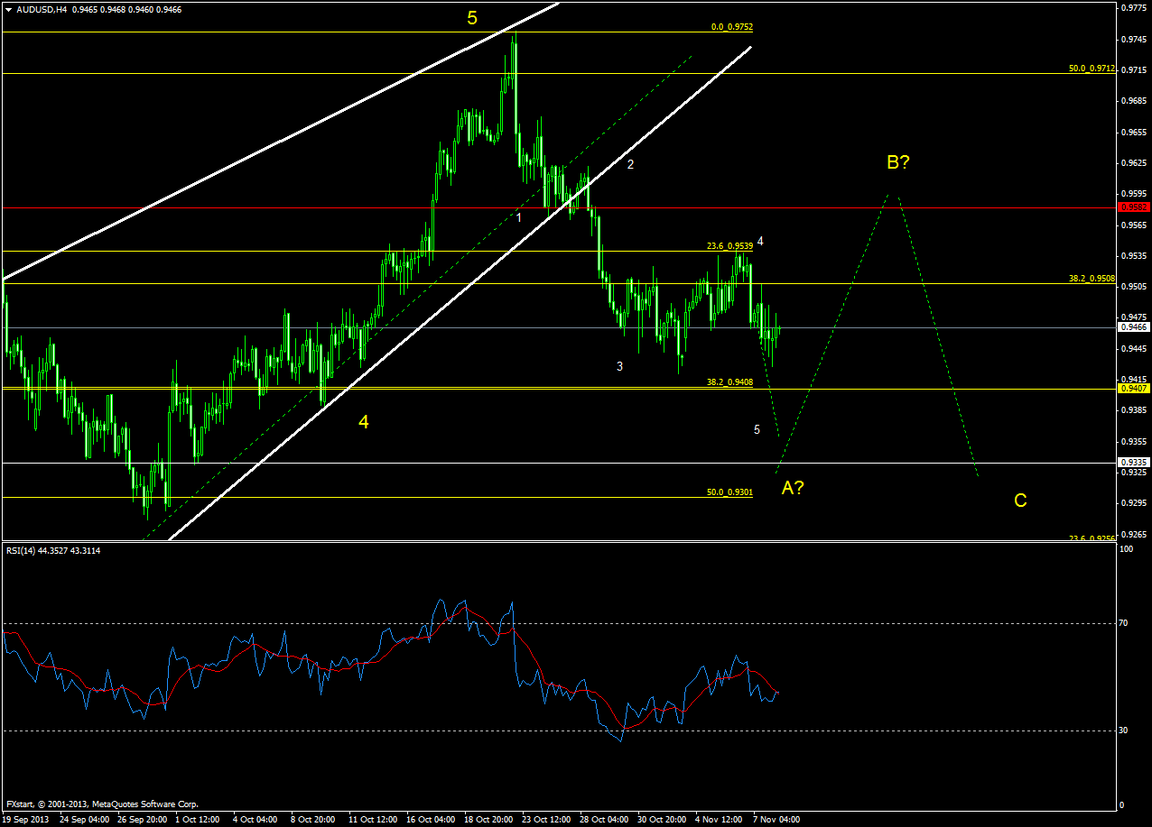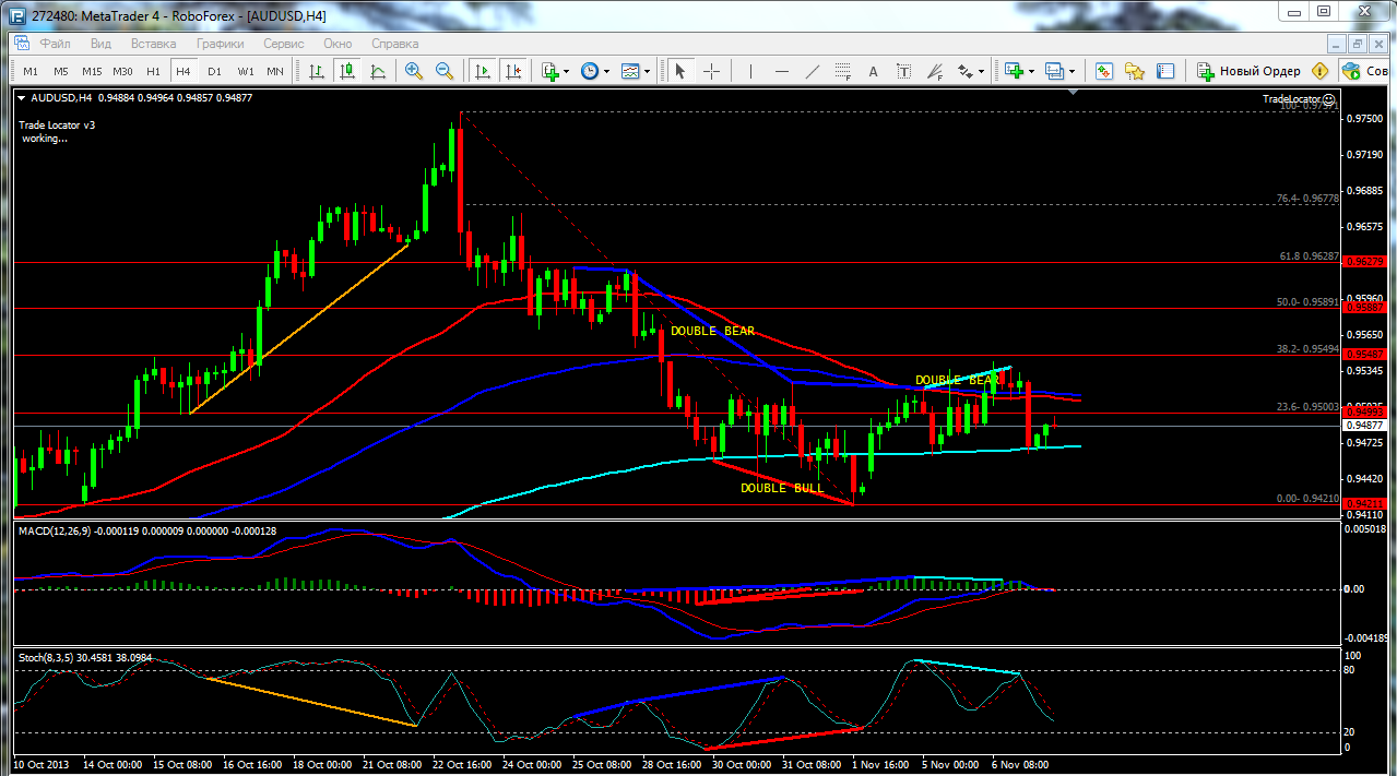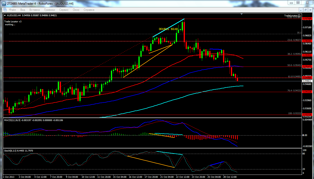 Пара AUDUSD H4 торгуется в нисходящем канале и ниже скользящих средних с периодами (50,100) Индикатор MACD-находиться в отрицательной зоне и дал сигнал на продажу.Индикатор стохастик-вошел в зону перекупленности и пока не подает четких сигналов.Цена торгуеться чуть ниже сильного уровня сопративления-0.9495(фибо-61.8) что дает подтверждение продолжения нисходящего тренда. Первая южная цель-0.9433(фибо-76.4) и 0.9333(локальный минимум 02.10.2013).Северные цели-0.9545(фибо-50.0 и ЕМА100), 0.9595(фибо 38.2), 0.9657(фибо23.6) и 0.9757(локальный максимум 23.10.2013). Прикрепленные файлы: